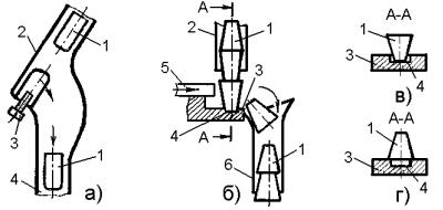 Когда же в систематизированном потоке, формируемом захватноподающими механизмами, изделия находятся в нескольких устойчивых положениях, то их окончательное ориентирование к одному заданному положению осуществляется разнообразными устройствами вторичного ориентирования. Например, колпачки 1 (рис.4.7а) из подающего лотка 2 в таком ориентирующем устройстве падают на винт 3. И если они движутся отверстием вниз, то надеваются им на винт, а затем опрокидываются и падают в отводящий лоток 4 донышком вниз. Если же колпачок движется донышком вниз, то он проскальзывает им по винту и поступает в отводящий лоток 4, не меняя положения. Таким образом, все колпачки поступают в отводящий лоток 4 только донышком вниз, то есть в одном требуемом положении.