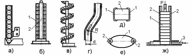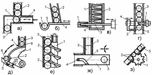 Прямолинейные магазины (рис.4.8а-б) по конструктивному исполнению являются наиболее простыми. Для удобства наблюдения за наполняемостью магазинов в их стенках, образующих канал, выполняют вертикальные окна или магазины выполняют полуоткрытыми (рис.4.8д). В переналаживаемых магазинах стенки 1 (рис.4.8д) образующие канал для изделий 2 могут выполняться раздвижными. Спиральные (рис.4.8в) магазины обычно обладают большой вместимостью и применяются для накопления объемных изделий типа тел вращения (шарообразных, цилиндрических, конических, овальных). Трубчатые магазины выполняются прямыми и изогнутыми (рис.4.8г), а также
