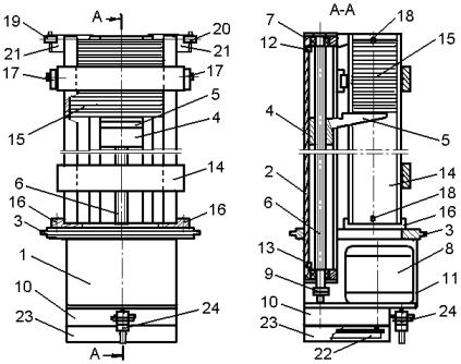 Сменная кассета 14 со стопою изделий 15 устанавливается в питателе на опоры 16 основания и фиксируется закрепленными на направляющей 2 держателями 17, путем западания их подпружиненных фиксаторов в адекватные отверстия скобы кассеты, соединяющей ее направляющие. При этом на концах направляющих кассеты 14 выполнены соосные резьбовые отверстия 18 в нижние из которых устанавливаются бобышки, удерживающие стопу, а через верхние отверстия проходит световой луч оптического датчика, состоящего из излучателя 19 и фотодиода 20, закрепленных на направляющей 2 посредством кронштейнов 21 и соединенных с электронным управляющим модулем 22, закрепленным на основании и закрытом кожухом 23. Напряжение на электрооборудование питателя подводится через разъем 24.