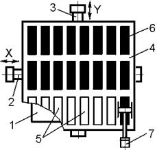 питатель содержит на своем основании стол 1 (рис.4.14), перемещающийся в шаговом режиме по координате X от привода 2, а в направлении Y – от привода 3. На столе питателя установлена сменная плоская кассета 4, в гнезда 5 которой уложены сориентированные изделия 6.
