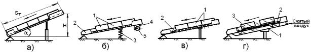Гравитационные транспортеры являются наиболее простыми и дешевыми устройствами, в которых сыпучая продукция, а также разнообразные штучные плоские и объемные изделия перемещаются под действием собственного веса по наклоненным к низу поверхностям. При этом объемные изделия в форме тел вращения обычно катятся по их опорным поверхностям или перекатываются с проскальзыванием, а сыпучая продукция и плоские изделия перемещаются только за счет скольжения. Угол наклона транспортирующих поверхностей в таких устройствах определяется, прежде всего, коэффициентом трения между их опорной поверхностью и перемещаемым грузом. Надежное движение груза по опорным поверхностям транспортеров скольжения (рис.5.1а) обычно устанавливается при достаточно больших углах их наклона к горизонту (не менее 30о). При меньших углах наклона грузы перемещаются в вибрационных гравитационных транспортерах (рис.5.1б), в транспортерах с шариковыми или роликовыми опорными поверхностями качения (рис.5.1в), а также в транспортерах с опорной поверхностью в виде воздушной подушки
