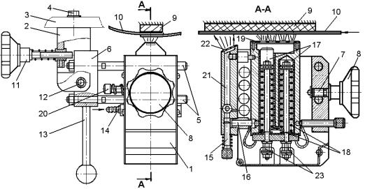 Устройство сварки горячим воздухом применяется в автомате модели М1-ОФК, упаковывающем мягкий диетический творог в пленочные оболочки диаметром до 55 мм. Выполняется такая оболочка из рукава, сворачиваемого из полиэтиленовой рулонной ленты толщиной 0,08 – 0,15 мм и свариваемого непрерывным продольным швом со скоростью до 15 м/мин с помощью данного устройства, которое располагается на кронштейне 2 (рис.8.13), прикрепленном к каркасу 3 автомата винтами 4. При этом сварочное устройство 1 установлено на направляющих колонках 5 подвижной части 6 кронштейна с возможностью перемещения по ним за счет зубчатой реечной передачи, шестерня 7 которой располагается на оси вращающейся рукоятки 8. Требуемое же расстояние между устройством 1 и опорной планкой 9, на которой свариваются внахлестку соединяемые концы рукава 10, устанавливается вращением винта 11, упирающегося в подвижную часть 6 кронштейна, шарнирно закрепленную через ось 12 на его неподвижной части. При технологических остановках автомата работающее устройство 1 отводится в сторону путем поворота на 90о подвижной части 6 кронштейна за рукоятку 13.