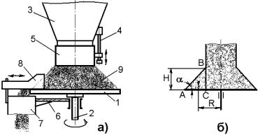 Рис.3.12. Конструктивная (а) и расчетная (б) схемы тарельчатого питателя