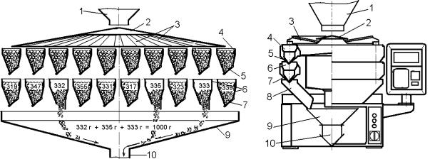 Такие дозаторы содержат от 8 до 24 одинаковых весовых устройств (рис.3.14), установленных обычно в круг и связанных с загрузочной воронкой 1 через конусообразное распределительное устройство 2 с направляющими радиальными желобами или вибролотками 3. Каждое весовое устройство включает в себя сопрягающийся с распределительным устройством 2 бункер 4 первичной загрузки с откидывающимся дном 5 и расположенный под ним весоизмерительный бункер 6, содержащий такое же откидывающееся дно 7 и электротензометрический весовой датчик, связанный с микропроцессорной взвешивающей мультисистемой дозатора. Откидывающееся дно на бункерах 4 и 6 приводится в действие от пневмопривода, а на последних усовершенствованных модификациях дозаторов – от шаговых электродвигателей, обеспечивающих программную регулировку величины его открытия. Этим достигается минимальная продолжительность выгрузки каждого конкретного продукта оптимальным потоком, а также снижается уровень вибрации и шума при работе. Под бункером 6 в каждом весовом устройстве располагается наклонный лоток 8, подающий отмеренную часть дозы в общую отводящую воронку 9, а из нее сформированная доза по продуктопроводу 10 фасуется в тару.