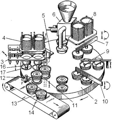 При этом на первой позиции вакуумными схватами 16 манипулятора механизма 3 нижние стаканы захватываются из магазинов 4 и устанавливаются попарно в гнезда карусельного стола. Одновременно на второй позиции штоки 17 с резиновыми подушками датировщика 5 опускаются внутрь стаканов и фиксируют их, а перемещающиеся вверх маркираторы прижимают в это время свои клейма к наружной стороне дна стаканов и отпечатывают дату. На третьей позиции из дозатора 6 в стаканы фасуются заданные порции упаковываемой продукции. На четвертой позиции вакуумными схватами механизма 7 нижние крышки извлекаются из магазинов 8, переворачиваются на 180о и перемещением вниз накладываются на стаканы с закреплением на отбортовке горловины замковым соединением. На пятой позиции пальцами манипулятора механизма 9 на поверхность крышек наносится по три клеевых пятна, а на шестой позиции вакуумными схватами манипулятора механизма 10 из магазинов извлекаются нижние этикетки, переворачиваются на 180о и перемещением схватов вниз наклеиваются на крышки. Седьмая позиция является резервной, а на восьмой позиции укупоренные стаканы выталкивателями 11 поднимаются из гнезд на уровень наружной поверхности стола и поворачивающейся рукой съемника 12 перемещаются с карусельного стола 2 на ленточный транспортера 13, который готовые упаковочные единицы 14 выводит из автомата. После же возвращения механизмов на всех позициях карусельного стола 2 в исходное положение, последний снова поворачивается на 45о и цикл повторяется.