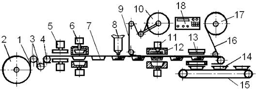 катушку 17, для последующей утилизации. Заданный автоматический режим работы линии обеспечивается микропроцессорной системой управления 18, обладающей необходимой гибкостью в установке и регулировании технологических параметров цикла.