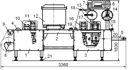 На сварном каркасе секции 3 крепятся две стойки, несущие микропроцессорный блок управления 6, устройство 13 размотки рулона покровной пленки и устройство 14 для наматывания отходов упаковочного полотна 15. Кроме этого на нем установлены блок 16 укупоривания тары, блок 17 отделения упаковок от полотна, транспортер 5, выводящий готовые