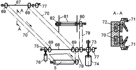 вконце проворота вала западает в выемку диска и с высокой точностью фиксирует перемещение транспортера на заданный шаг. Затем на всех позициях линии исполнительными устройствами выполняются соответствующие технологические операции. В это же время пневмоцилиндром 74 в исходное положение возвращается рейка-шток и находящийся с ней в зацеплении свободно вращающийся в обратную сторону корпус обгонной муфты 73 и далее цикл повторяется.