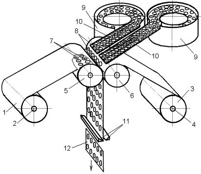 Для поштучного упаковывания таблеток, драже, капсул и других аналогичных изделий в групповую ячеистую блистер-упаковку созданы и широко применяются вертикальные роторные формовочно-упаковочные автоматы, работающие с двух рулонов. В этих автоматах рулон 1 (рис. 11.24) термоформуемого ленточного материала устанавливается на оправке 2 одного механизма размотки, а рулон 3 покровного ленточного материала – на оправке 4 второго механизма размотки. Далее ленты этих рулонов через систему роликов механизмов амортизации и натяжения ленты (не показаны) сводятся и