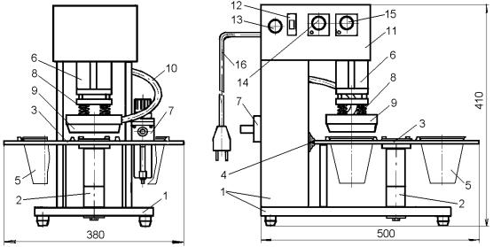 На основании 1 (рис. 11.25) этого устройства вертикально крепится ось 2, несущая карусельный стол 3. В карусельном же столе, циклически поворачивающемся на 90о и фиксируемом при этом механизмом 4 сблокированным с кнопкой включения, содержится четыре симметрично расположенных отверстия, в которые вставляются повисающие на отбортовке укупориваемые стаканы 5. В свою очередь над карусельным столом соосно с укупорочной позицией к основанию устройства вертикально прикреплен пневмоцилиндр 6, рабочие полости которого через распределитель и блок подготовки воздуха 7 соединяются с питающей магистралью сжатого воздуха. На штоке же этого пневмоцилиндра через блок амортизирующих пружин сжатия 8 крепится контактный электронагреватель 9, соединяющийся кабелем 10 с пультом управления 11, содержащим на своей лицевой панели выключатель 12, лампочку 13 световой индикации наличия напряжения «Сеть», а также реле времени (таймер) 14 и регулятор 15, поддерживающий заданную температуру на контактном электронагревателе 9. К источнику питания в свою очередь пульт управления присоединяется сетевым кабелем 16.
