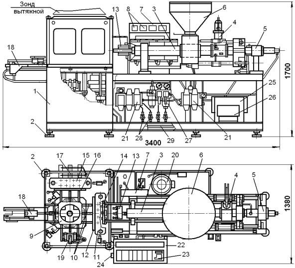 После завершения приведенных действий на всех четырех технологических позициях агрегата срабатывает механизм запирания 11 и, перемещая вверх подвижную плиту, раскрывает литьевую форму 12, а механизмом 15 и блоком 17 в это же время раскрывается выдувная форма 16. Далее штоком приводного гидроцилиндра револьверный стол 9 перемещается в верхнее положение, затем гидромотором поворачивается в плане на 90о с фиксацией положения и снова возвращается в нижнее исходное положение, перенося при этом на оправках 10 отлитые ампулообразные заготовки на вторую технологическую позицию, а готовые изделия – на третью позицию. После этого механизмами 11, 15 и 17 формы 12 и 16 снова смыкаются и цикл повторяется. Агрегат может работать в наладочном, полуавтоматическом и автоматическом режимах.