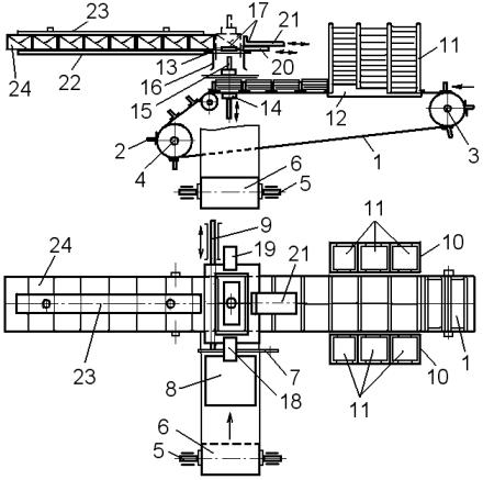 ленточный транспортер 35, выносящий брикеты 33 из автомата на позицию их укладки в транспортную тару.