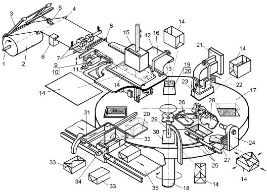возвратно-поступательное перемещение пуансона 15, при котором лист обертки 14 продвигается внутри формующей матрицы 13 механизма 12 и складывается в прямоугольную тару, помещаемую в гнездо 19 на первой позиции карусельного стола;