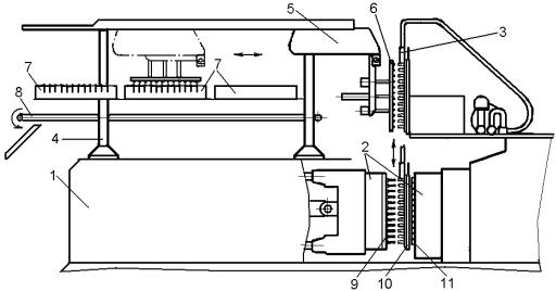 размыкается. При этом модулем 9 формы стержни 12 выводятся из полости отлитых преформ, и механизмом 3 ее модуль 10 матриц перемещается в верхнее положение, где позиционируется перед захватом робота 5. Далее робот 5 забирает групповым захватом 6 преформы из матриц модуля 10 и укладывает их в свободные ячейки одной из трех станции 7 холодильного агрегата 4, где они окончательно охлаждаются в течение двух технологических циклов. Одновременно с этим модуль 10 матриц механизмом 3 возвращается в нижнее исходное положение, литьевая форма 2 смыкается пятизвенным механизмом узла запирания и цикл повторяется. В это время полностью охлажденные преформы из очередной станции 7 перегружаются на движущуюся ленту транспортера 8, перемещающую их в накопительный бункер, и далее робот 5 укладывает в нее новую партию изготовленных преформ.