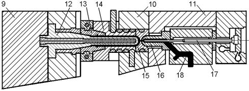Установленная в термопластавтомате 48-ми местная горячеканальная литьевая форма 2 состоит в свою очередь из трех сопрягающихся частей: модуля 9 стержней, модуля 10 матриц и модуля 11 горячих каналов, при этом каждая литьевое гнездо в этой форме собирается из отдельных однотипных деталей, в том числе (рис.13.7): стержня 12, формирующего внутреннюю полость преформы; вставок 13 и 14 матрицы, оформляющих наружную поверхность горловины и корпуса преформы; а также литниковой втулки 15, сопла 16 и иглы 17, обеспечивающих подачу устройством впрыска по каналу 18 расплава материала в рабочую полость гнезда. Таким рациональным конструктивным исполнением обеспечивается быстрая замена деталей в литьевых гнездах без снятия формы с термопластавтомата и ее удобное обслуживание.