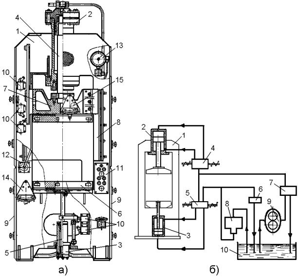 Внастоящее время широкое распространение получили прессы с индивидуальным гидравлическим приводом. Эти прессы имеют рамную (рис.13.9а) либо колонную конструкцию станины и верхнее или нижнее расположение главного (прессующего) гидроцилиндра, а сама гидростанция обычно располагается при этом сзади или сбоку от пресса. Индивидуальный гидропривод включает в себя закрепленные на станине пресса 1 (рис.13.9б) главный 2 и выталкивающий 3 гидроцилиндры, которые соединяются с гидросистемой, содержащей распределители 4 и 5, циркуляционные клапаны высокого 6 и низкого 7 давления, масляные насосы высокого 8 и низкого 9 давления, а также бак 10 с маслом.