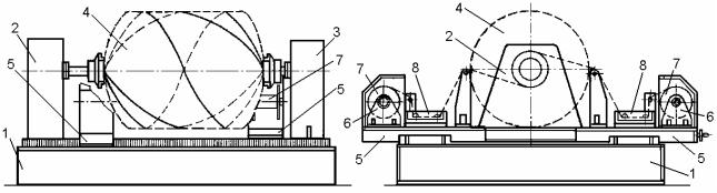 В частности станок, обеспечивающий формование, как замкнутых оболочек, так и корпусов с открытыми торцами их спиральной навивкой, состоит из станины 1 (рис.15.1), несущей стойки 2 и 3 во вращающихся шпинделях которых устанавливается съемная оправка 4. По направляющим же станины возвратно-поступательно перемещаются две каретки 5, каждая из которых содержит шпулярник 6, в котором устанавливается взаимодействующая с фрикционным тормозом сменная катушка 7 с намотанным армирующим материалом, а также ванну 8, заполненную полимерным связующим. От привода станка, расположенного внутри станины, через соответствующие передаточные и настроечные механизмы осуществляется вращение оправки 4 и взаимосвязанные с ней возвратнопоступательные перемещения кареток 5 по направляющим.