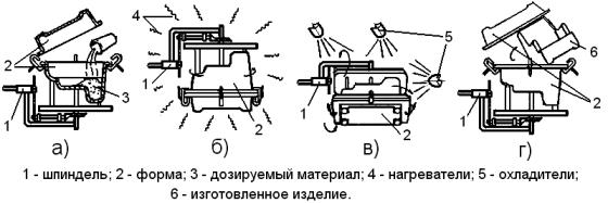 Процесс изготовления изделий ротационным формованием включает нанесение на поверхность полости формы антиадгезива, дозирование сырья, загрузку отмеренной дозы в форму и ее закрытие, приведение формы во вращение, нагрев формы и материала, охлаждение формы и находящегося в ней изделия, остановку и раскрытие формы, а также извлечение из нее отформованного изделия. Весь этот процесс обычно разделяют на следующих четыре характерных этапа.