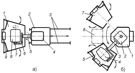 В частности, челночная одношпиндельная воздушно-ротационная установка состоит из камеры 1 (рис.15.4а) и ротационного агрегата 2, возвратно-поступательно перемещающегося по рельсовому пути 3 из исходной позиции к камере. На станине агрегата в свою очередь располагается башня 4 с полым шпинделем 5, на конце которого содержится кронштейн 6, несущий вращающийся фланец 7 с закрепленной перпендикулярно оси шпинделя формой 8. Во вращение же шпиндель 5 и фланец 7 приводятся от расположенного в станине электродвигателя через коробки переключения скоростей и соответствующие передаточные механизмы, содержащие проходящий через шпиндель вал, соединяющий фланец 7 с приводом. Камера 1 установки состоит из стационарно закрепленного закрытого каркаса и двух шарнирно присоединенных к нему створок, расходящихся от пневмопривода 9 при подаче в нее формы 8, перемещающимся в рабочее положение агрегатом 2. Камера также оснащена системой газопламенного нагрева формы 8 с рециркуляционным вентилятором и системой охлаждения формы распыляемой сжатым воздухом водной дисперсией, поочередно включаемыми в работу.