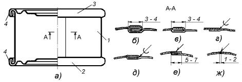 Различают двойные (рис.16.1б) и одинарные (в замок) (рис.16.1в) фальцевые соединительные швы, выполненные без дополнительной герметизации и герметизированные пайкой, уплотнительными пастами или резиновыми прокладками. При выполнении паяных швов концы заготовки корпуса соединяются внахлестку (рис.16.1г) или одинарным фальцевым соединением (рис.16.1д). Швы внахлестку конструктивно проще, однако не покрытая кромка бланка, находящаяся внутри банки, быстро окисляется и коррозирует, и кроме этого возможно попадание в полость банки припоя соединительного шва и переход содержащегося в нем свинца в упаковываемый продукт. Эти недостатки отсутствуют в паяных фальцевых соединениях, поэтому они и применяются на банках, предназначенных для упаковывания пищевой продукции. Сварные же соединительные швы выполняются внахлестку (рис.16.1е) электрической контактной роликовой сваркой или стыковым соединением (рис.16.1ж) с использованием в качестве плавящегося электрода медной калиброванной проволоки.