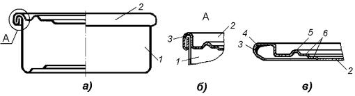 Стандартные сборные банки всех видов выполняются с продольным одинарным (рис.16.1в) фальцевым соединительным швом, герметизируемым пайкой припоями марок ПОС40, ПОССу40-2, ПОССу50-0,5 и другими, основными компонентами которых являются олово и свинец. Концы же (донышко и крышку) присоединяют к корпусам консервных банок двойным закатным фальцевым швом (рис.16.2б), включающим герметизирующую прокладку 3 и пять слоев жести, три из которых принадлежат концу 2 и два – корпусу 1. В конструктивных исполнениях концов различают подвитый закаточный фланец 4 (рис.16.2в), эластичную уплотнительную прокладку 3 и специальный кольцевой рельеф, состоящий из выступа 5 и нескольких ступеней 6, способствующих их упругой деформации от перепада давления при стерилизации консервов. Форма рельефа может иметь при этом несколько различных исполнений. Уплотнительные прокладки 3 в жестебаночном
