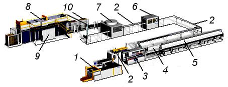 пакетоформирующий агрегат 8, группирующий изготовляемые банки и формирующий из них на поддоне транспортные пакеты 9, которые после контроля и учета вилочным погрузчиком доставляются на склад;