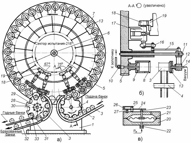 После этого полости камеры 8 и банки 3 соединяются с атмосферой, и далее соответствующим золотником к отверстию в упругом диске 13 через шток 14 подключается вакуум, притягивающий и удерживающий банку на диске. При дальнейшем вращении колеса 5 коническая шестерня 18 испытательного устройства входит в зацепление со следующим неподвижным зубчатым сектором 19 и, поворачивая на 180о кривошип 16, перемещает кронштейн 12 обратно в исходное положение, вместе с удерживаемыми на его двух упругих дисках 13 банками, которые при этом переходят в гнезда синхронно вращающегося выносящее-браковочного ротора 28. По завершению этого
