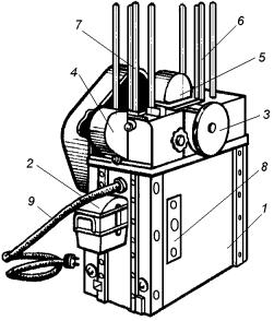 Ротационные маркировочные автоматы позволяют наносить в строке до семи знаков. Они состоят из станины 1 (рис.16.33), электродвигателя 2, приводного вала со штурвалом 3 ручного проворота, цепного транспортера 4 подачи крышек, синхронно вращающихся барабанов инструментального блока 5, расходного 6 и приемного 7 магазинов, а также панели управления 8 и кабеля питания 9.