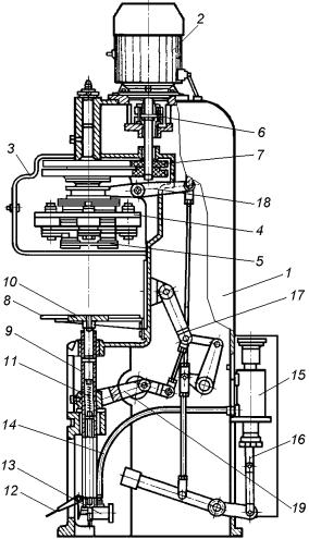 (рис.16.34), в верхней части которой установлены электродвигатель 2 и закаточная головка 3, планшайба 4 которой, несущая обжимные ролики 5, соединена с электродвигателем через муфту 6 и зубчатую цилиндрическую передачу 7. В нижней же части станины в отверстии стола 8 соосно с планшайбой 4 на шпинделе 9, располагается патрон 10, опирающийся на компенсационную пружину 11. Под шпинделем установлена педаль 12, связанная с золотниковым клапаном 13, соединенным в свою очередь трубопроводом 14 с пневмоцилиндром 15, выдвигающийся шток 16 которого осуществляет через многозвенный рычажный передающий механизм 17 и коромысло 18 включение муфты в закаточной головке 3, а также через рычаг 19 вертикальное перемещение шпинделя 9.