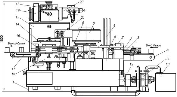 вакуумной системы, содержащей: насосную установку, состоящую из водосборника 10 и смонтированных на общей раме водокольцевого насоса 11 типа ВВН-1,5 с электродвигателем 12 мощностью 4 кВт; вакуум-камеру 13, являющуюся герметичной полостью станины, в которой находится закаточный ротор; установленный на стенке камеры вакуум-клапан 14, с приводом и транспортным ротором, в корпусе которого имеется пробка с карманом для банок; механизм шлюзования, регулирующий разрежение (остаточное давление 34,6 МПа) в вакуум-камере; контрольную и сигнальную аппаратуру, а также соединительную систему трубопроводов;