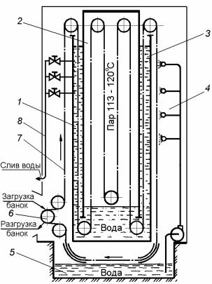 Высокопроизводительный непрерывнодействующий гидростатический стерилизатор модели А9-ФСА, например, состоит из водяной камеры 1 подогрева (рис.16.37), паровой камеры 2 стерилизации, водяной камеры 3 первичного охлаждения, камеры 4 дополнительного охлаждения водой, бассейна 5 с охлаждающей водой, механизма 6 загрузки и выгрузки банок, цепного бесконечного транспортера 7, трубопровода 8 слива отработавшей воды в канализацию, а также системы автоматического регулирования температуры стерилизации. Корпус стерилизатора выполнен секционным, а его камеры разделяются двойными теплоизолирующими перегородками.