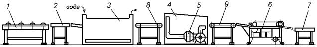 состоит из рольганга 1 (рис.16.41), приемных столов 2 и 7, туннельной моечной машины 3, туннельной сушильной камеры 4 с электрокалорифером 5, этикетировочного автомата 6, а также ленточных транспортеров 8 и 9.