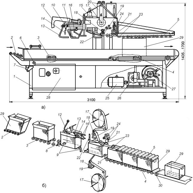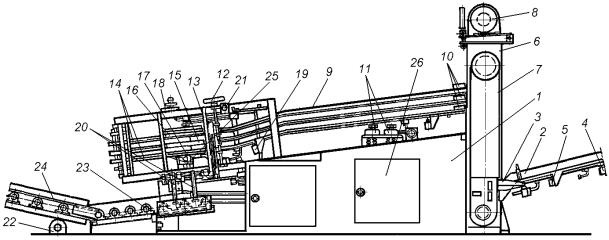 отводящий транспортер 22, доставляющий заполненные ящики на позицию их укупоривания, маркировки и этикетирования; на своем сварном каркасе он содержит приводной приемный рольганг 23 и сопрягающийся с ним передающий клиноременной транспортер 24;