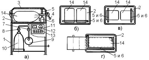 При упаковывании полимерный пакет 14 заполняют продукцией, а затем укладывают его в камеру 2 машины так, чтобы горловина пакета лежала на сварочной линейке 6. После этого камера герметично закрывается крышкой 3, фиксируемой в рабочем положении поворотом рычага 4, и вакуумируется, соединяясь через открывшийся клапан 7 с вакуумным насосом 9. После удаления воздуха из камеры и тары 14 до заданного уровня, контролируемого вакуумметром 12, клапан 7 закрывается, одновременно открывается клапан 8, и камера вместе с тарой заполняются модифицированной газовой смесью, поступающей из баллона 10. Затем сварочная линейка 6 приподнимается вертикально и смыкается с опорной линейкой 5, пережимая и укупоривая горловину пакета герметичным швом термоимпульсной сварки, продолжительность которой контролирует реле времени 13. В это время клапан 8 закрывается, а клапан 7 переключается в положение, обеспечивающее соединение камеры 2 с атмосферой. Затем крышка 3 открывается, готовая упаковочная единица 14 удаляется из камеры и цикл повторяется.