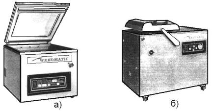 Вакуумупаковочные машины производятся сегодня многими фирмами в широком диапазоне технических характеристик и исполнений: однокамерными и двухкамерными; стационарными напольного и переносными настольного типа. При этом в двухкамерных машинах (рис.10.4б) одной установленной на шарнирах крышкой поочередно могут закрываться и герметизироваться две