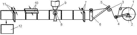 валковая подача 5, осуществляющая совместно с клещевой подачей 9 шаговое синхронное продвижение полурукавной ленты;