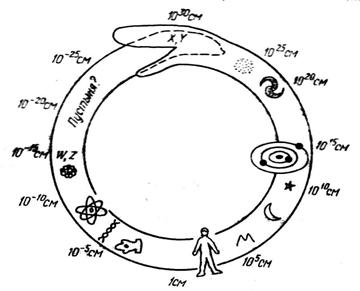 Перехрещення об’єктів дослідження космології, яка вивчає явища космічних масштабів, з фізикою високих енергій, яка досліджує властивості речовини на гранично малих відстанях, вказує на наявність глибинних взаємозв’язків між нескінченною великим і нескінченно малим. Розвиток цього взаємозв’язку схематично проілюстровано на рис.