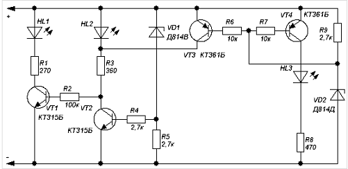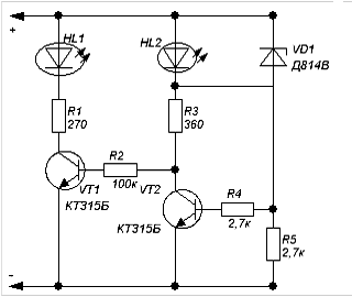 відповідно двох стабілітронів КС156, КС147, та два світлодіоди (червоного та