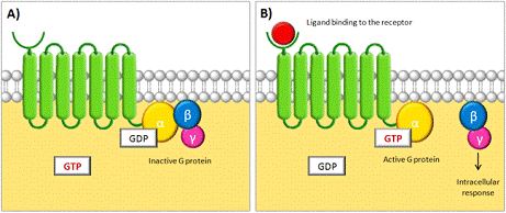Історія вивчення адренорецепторів тісно пов'язана з відкриттям біологічної функції катехолінів в клітинах надниркових залоз. Незважаючи на те що адренорецептори в нервової тканині присутні у відносно невеликій кількості, вони грають важливу роль в регуляції психоемоційних функцій і діяльності всіх відділів серцево-судинної системи. [9]білки мають суттєві відмінності в різних класах адренергічних рецепторів. Важливою загальною їх властивістю є взаємодія з ГТФ і ГДФ. У неактивному стані вони пов'язані з ГДФ. При взаємодії нейромедіатора з рецепторним білком останній вступає в контакт з G-білком і змінює його конформацію так, що на місце ГДФ стає ГТФ. З цього моменту G-білок набуває здатності впливати на активність білка-ефектора. [4][9]
