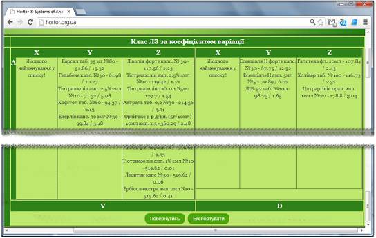 Комп’ютерна програма Hortor призначена для прийняття управлінських рішень з оптимізації збалансованості асортименту ЛЗ в аптеках і локальних формулярах шляхом проведення автоматизованого інтегрованого ABC/FMR/XYZ/VED-аналізу (авторське свідоцтво 46373 від 13.11.2012). Hortor дозволяє проводити ABC, FMR, XYZ та VED аналізи, або будь-яку комбінацію з двох чи трьох вказаних аналізів. При побутові цієї комп’ютерної програми використаний лінійний алгоритм інтегрованого ABC/FMR/XYZ/VED-аналізу, запропонований В.П. Поповичем.