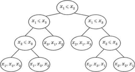 Ця схема представляв собою бінарне (двійкове) дерево, у вуз-лах якого розміщені пари елементів, що порівнюються на кожному кроці. Pyx гілками дерева від його кореня (найвищої вершини) визначає конкретну гілку, яка у свою чергу є одним із варіантів отримання розв'язку задачі. Ліва гілка кожної вершини відповідає виконанню зазначеної у вершині умови, а права - ні. Кожна гілка завершується вершиною, де вказаний порядок розміщення заданих елементів, що задовольняє розв'язок задачі. Кількість таких гілок визначає кількість можливих варіантів отримання розв'язків задачі. Максимальна довжина гілки дорівнює кількості ребер, якими треба пройти від кореня дерева до останньої вершини у цій гілці. Таке дерево називається деревом розв'язків. За допомогою дерева розв'язків можна визначити кількість операцій, необхідних для роз-в'язування поставленої задачі.