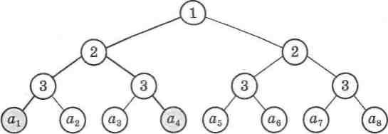 3 огляду на проведений аналіз алгоритму рекурсивного бі-нарного пошуку визначимо оцінки його ефективності. На ма-люнку 37 зображено дерево пошуку розв'язку задачі для п = 8. У термінальних вершинах дерева вказані самі елементи месиву, серед яких можуть бути шукані елементи. В інших вершинах дерева вказано рівень поділу задачі на підзадачі: у ко-реневій - 1, оскільки це перший поділ, у наступних - 2, бо на цьому рівні йде поділ ще на дві підзадачі і т. д.