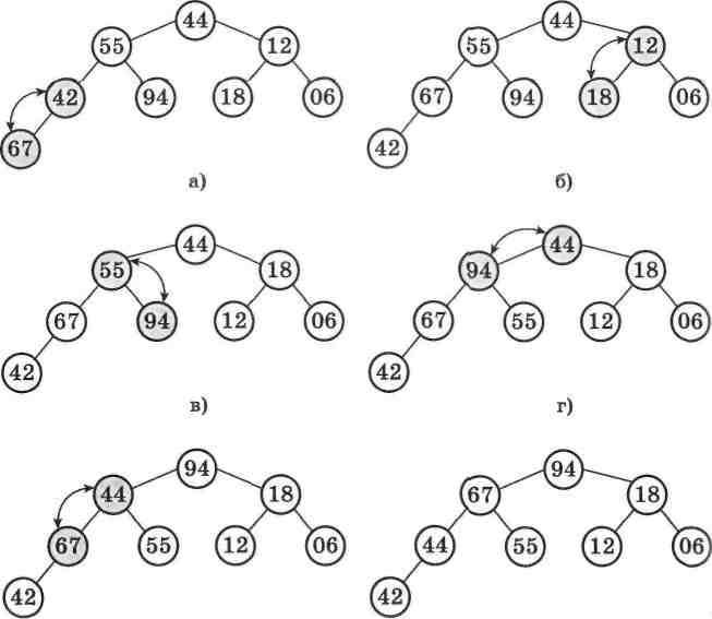 Як же виглядає тепер перетворений масив? Запишемо значения вершин отриманої піраміди (мал. 60, д) у вигляді масиву: 94, 67, 18, 44, 55, 12, 06, 42.