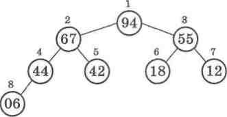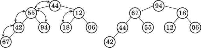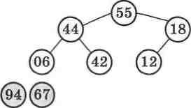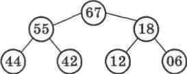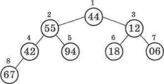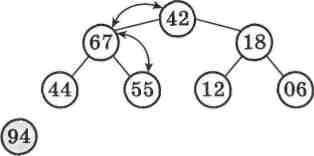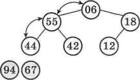 А тепер давайте представимо у вигляді бінарного дерева (мал. 59) той самий масив, відсортований у порядку спадання: 94, 67, 55, 44, 42, 18, 12, 06.