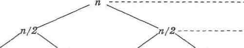 Оскільки ми кожного разу поділяли масив на дві частини, а отримані дві частини знову на дві, то це приводить до думки про існування логарифмічної залежності, яка була визначена і під час аналізу алгоритму пірамідального сортування. «Гли-бина» такого поділу, або кількість поділів, буде log2n. Можна представити процес поділу масиву навпіл у вигляді дерева ре-курсії на схемі (мал. 77).