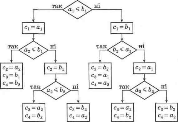 Будемо міркувати так. Якщо а, < Ь,, то с1 - av інакше -с1 = bv Наступний вибір для перенесения значения елемента в с2 буде відбуватись між аг та Ь1 у першому випадку та між а1 та Ьг - у другому. Як не заплутатися в тому, який елемент з масиву а та масиву b записаний на даному кроці в масив с? На якому елемента в кожному з масивів ми зупинилися? У даному випадку найпростіше навести схему алгоритму злиття двох упорядкова-них послідовностей, у кожній із яких по два елементи, в одну упорядковану послідовність із чотирьох елементів (мал. 79).