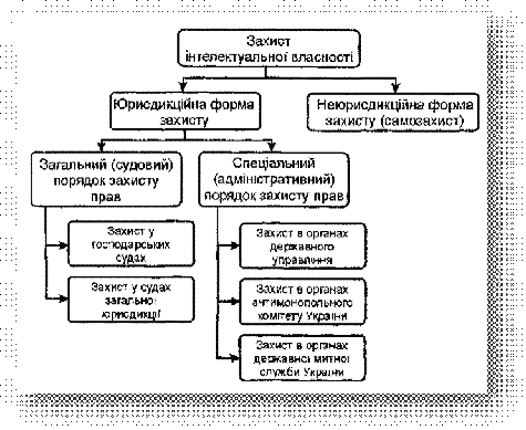 Існує дві форми захисту прав інтелектуальної власності юрисдикційна і неюрисдикційна (рис. 3.1). Неюрисдикційна форма передбачає захист права інтелектуальної власності своїми силами, без звернення за допомогою до державних або інших компетентних органів, тобто самозахист. Наприклад, це може бути відмова здійснити певні дії, передбачені укладеним договором про передачу (уступку) майнових прав інтелектуальної власності або ліцензійним договором, відмова від виконання недійсного договору тощо. Обрані засоби самозахисту не повинні бути забороненими законодавством та не повинні суперечити моральним засадам суспільства.