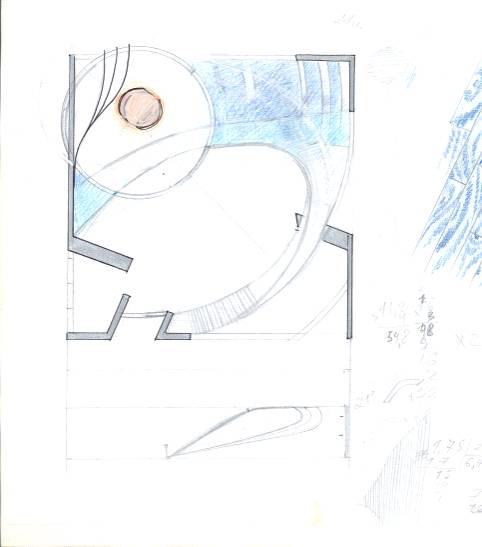 Кругла конструкція з склокомпозиту знаходиться під кутом 80°, і меблі у залі знаходяться під тим же нахилом, продовжуючи вищеописану тенденцію. Дивани та журнальний столик мають теж формоутворення як і у всьому інтер’єрі - виростають з горизонталі та знову повертаються в неї.