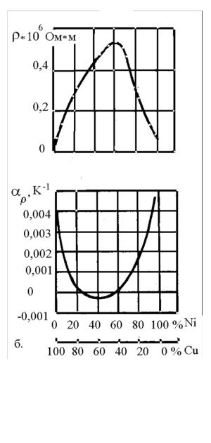 Константан – 60 % – Сu, 40 % – Ni. Данное соотношение меди и никеля, обеспечивает максимальное значение ρ и минимальное значение αρ (близко к 0 и обычно имеет отрицательный знак) (рис. 3.2). Хорошо поддается обработке. При нагреве до 400 – 500 °С на поверхности образуется прочная и