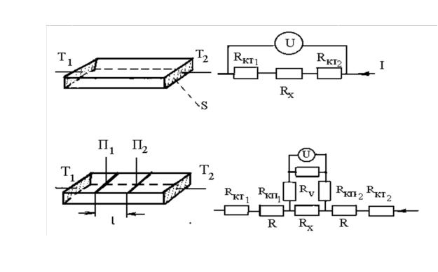материалов. Измерение величины удельного электрического сопротивления проводниковых и полупроводниковых материалов затруднено существованием так называемых контактных сопротивлений, возникающих в местах соприкосновения измерительных электродов с поверхностью образца. Величина контактного сопротивления определяется материалом проводника и контактов; состоянием их поверхности; контактным усилием и рядом других факторов.При использовании двухэлектродной схемы (рис. 3.3, а), когда падение напряжения на образце измеряется с помощью тех же электродов (Т1 и Т2), через которые к нему проводится ток, величина контактных сопротивлений (RКТ1 и RКТ2) входит составной частью в общее измеряемое сопротивление, что вносит большую погрешность в определяемое значение RХ, а следовательно, и ρ. С целью снижения этой погрешности при измерении удельного сопротивления проводников и полупроводников применяют четырехэлектродный (четырехзондовый) метод (рис. 3.3, в).